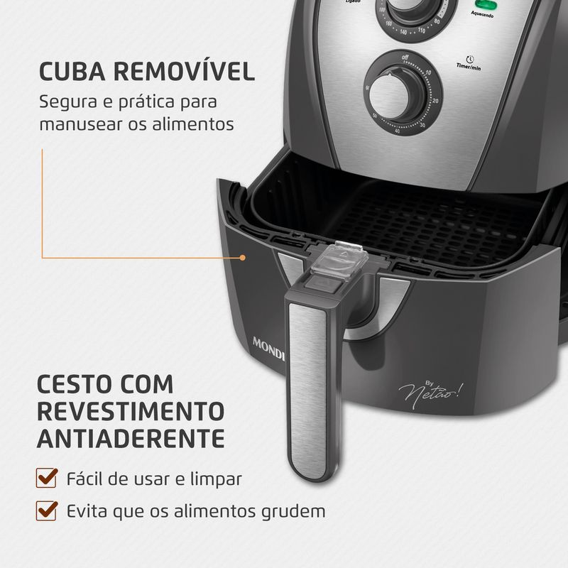 Prepare receitas de forma prática, rápida e saudável com a Air Fryer Mondial by Netão. O cesto quadrado com capacidade de 4 litros acomoda melhor os alimentos, permitindo assar por igual. Possui controle de temperatura até 200°C para o preparo de diversas receitas, sem precisar adicionar óleo ou manteiga. Aliada à alta potência, a tecnologia da AFN-NT-01 também possibilita rapidez nos preparos.