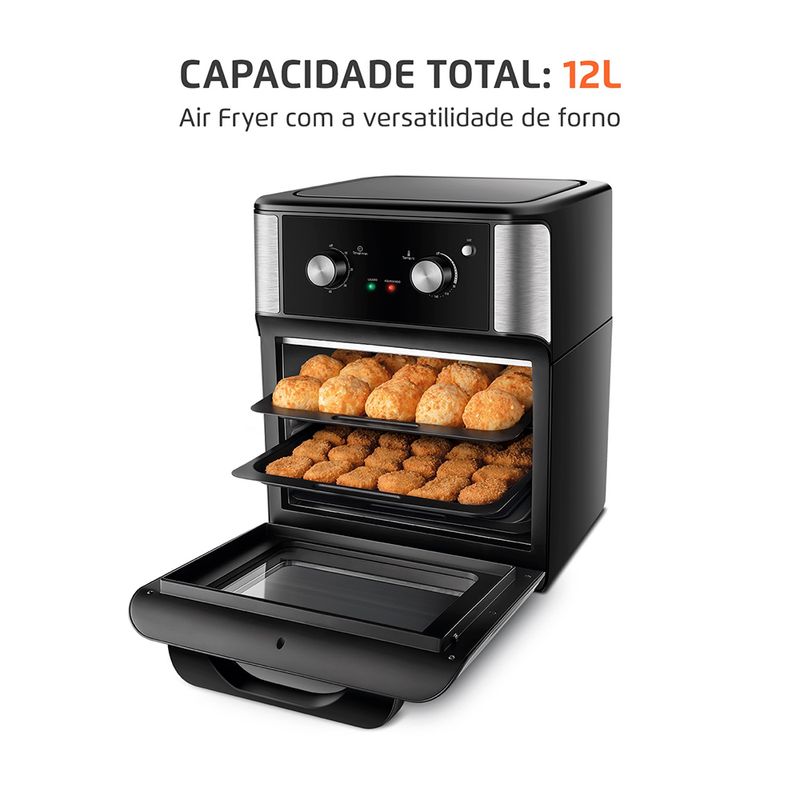 A Air Fryer Forno da Mondial é 2 em 1: fritadeira a ar com o espaço e a versatilidade do forno. Você pode assar, cozinhar e fritar sem óleo e produzir receitas muito mais saudáveis! A capacidade total de 12 litros permite o preparo de grandes porções e de uma só vez. Além disso, a Air Fryer vem com 3 assadeiras: a assadeira tipo cesto é perfeita, pois possui capacidade para preparar até 500g de batata frita e a assadeira fechada é ótima para fazer legumes e alimentos com molhos. Saiba mais sobre a AFON-12L-AB: