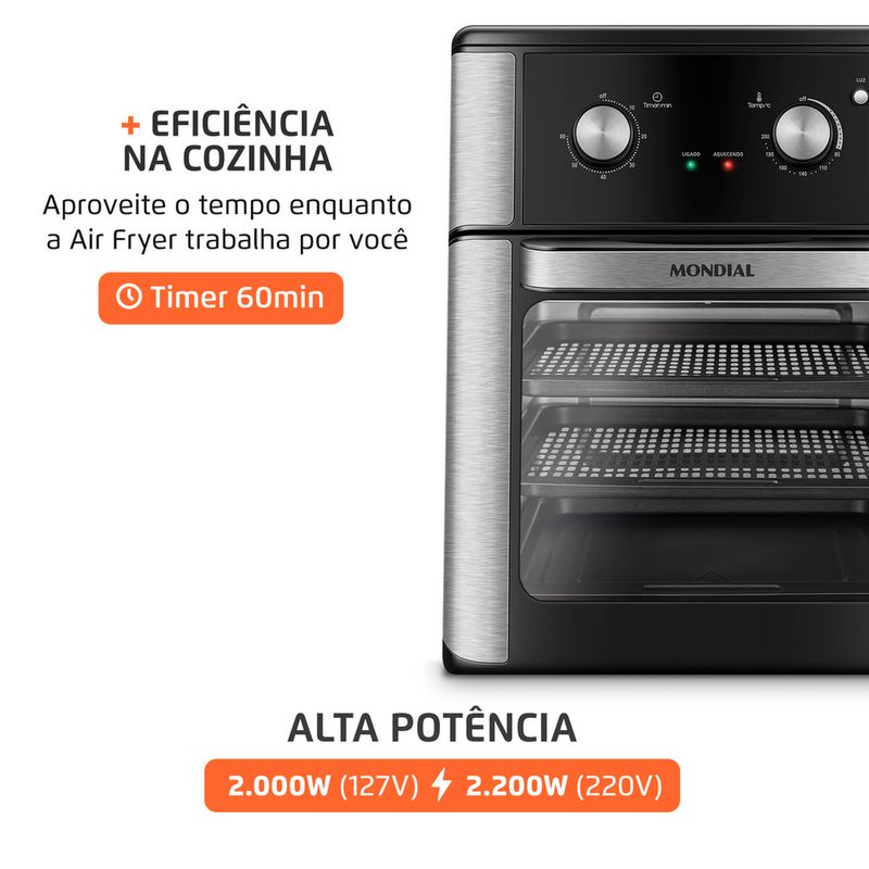 2 EM 1 - AIR FRYER + FORNO: A família de Air Fryers Mondial continua crescendo! O modelo OVEN une as vantagens da tecnologia da Air Fryer ao espaço e versatilidade do forno. Você pode assar, cozinhar e fritar sem óleo e com perfeição.