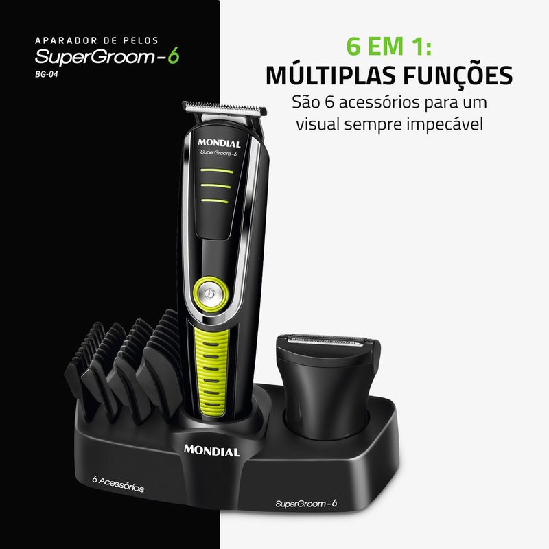 O Aparador de Pelos SuperGroom Mondial é ideal para manter o visual sempre em dia, com muita praticidade! O aparelho conta com 2 tipos de aparadores para cabelo, rosto e corpo e 4 pentes de corte com guias de 3, 6, 9 e 12mm, para a remoção dos pelos no comprimento que preferir. Suas lâminas em aço inox oferece alto desempenho para um corte rente, preciso e suave. Saiba mais sobre o BG-04 da Mondial: