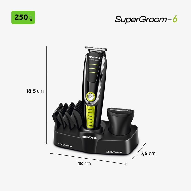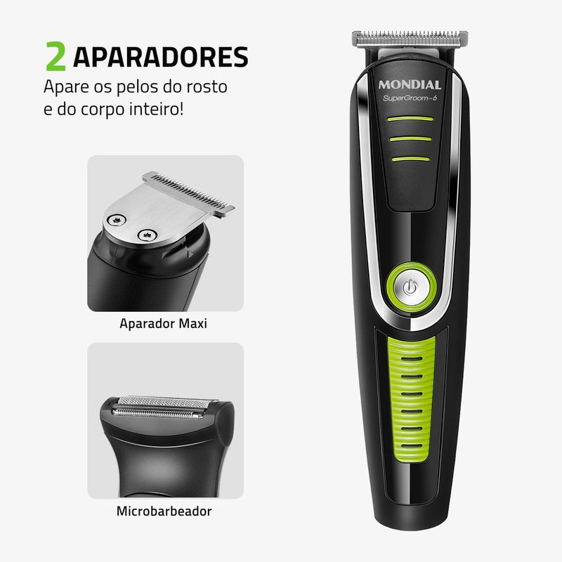 6 EM 1: O aparador de pelos da Mondial vem com 6 acessórios: são 2 tipos de aparadores de alto desempenho e 4 pentes de corte com diferentes opções de altura para aparar e remover os pelos do rosto e do corpo inteiro. Você pode ter uma aparência impecável sem sair de casa!