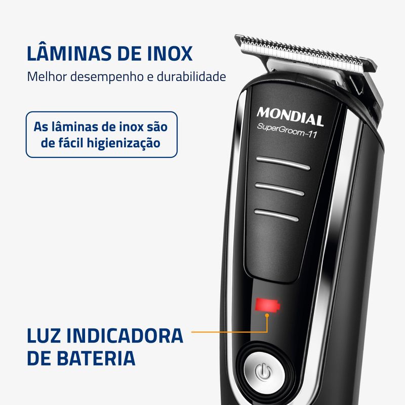 11 EM 1 - MÚLTIPLAS FUNÇÕES: O aparador de pelos da Mondial vem com 11 acessórios: são 5 tipos de aparadores e 6 pentes de corte com diferentes opções de altura para aparar e remover os pelos do rosto e do corpo inteiro. Você pode ter uma aparência impecável sem sair de casa!
