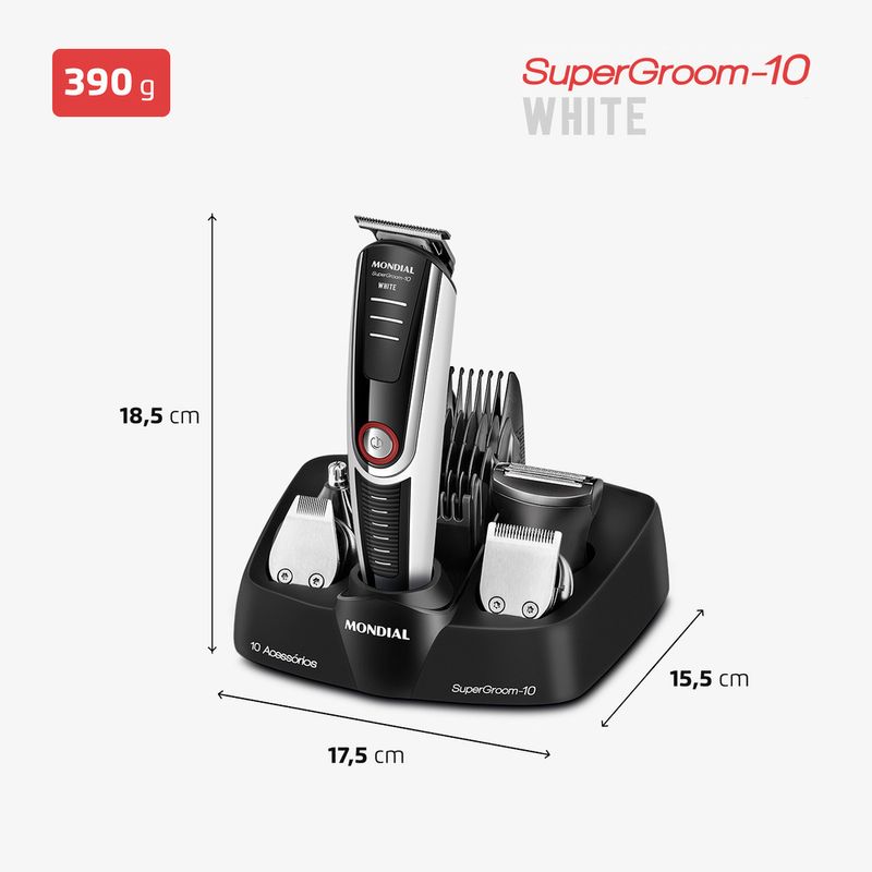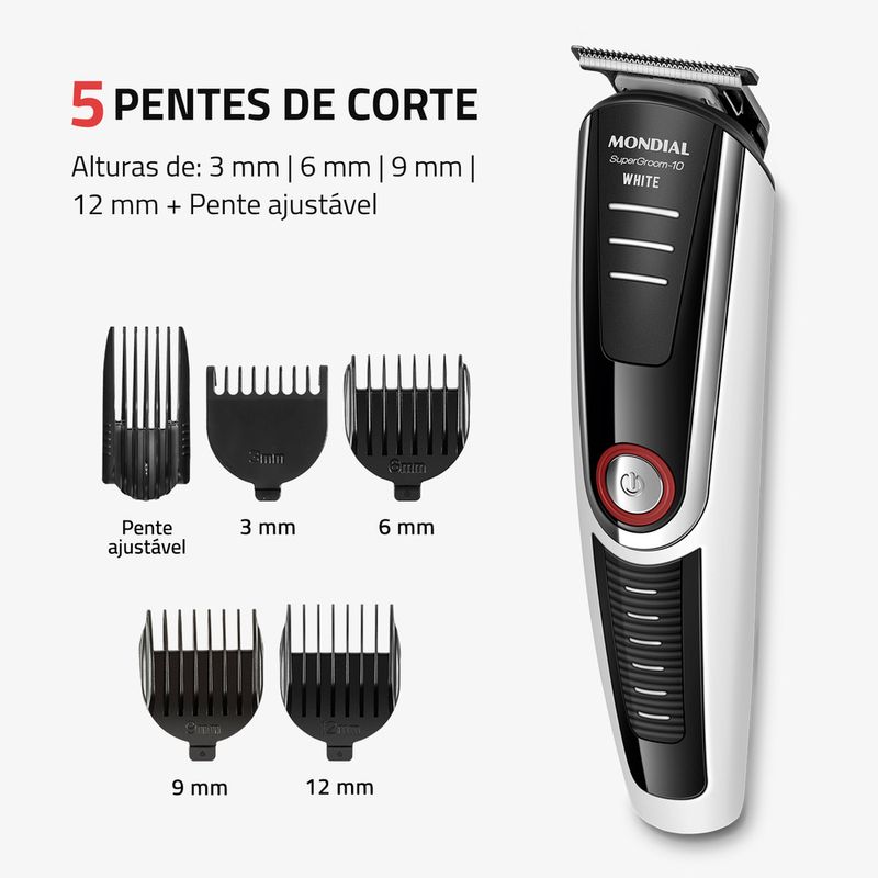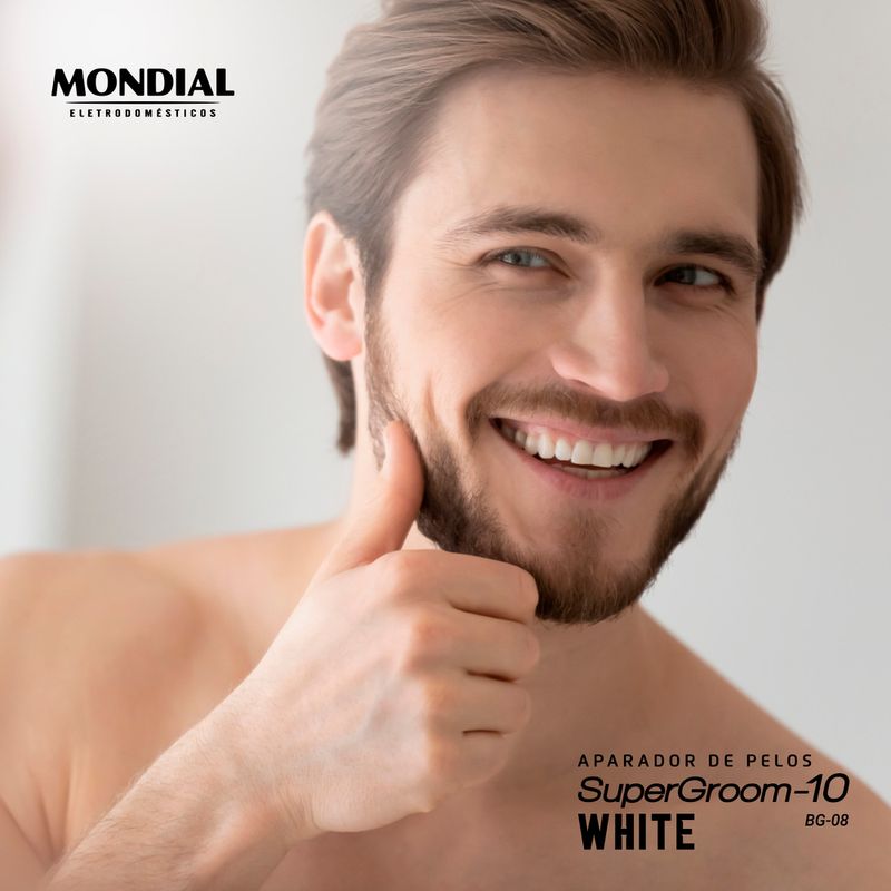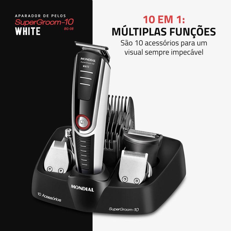 O Aparador de Pelos SuperGroom White possui a funcionalidade de 10 produtos em apenas 1! Conta com 5 aparadores para cabelo, rosto e corpo, 4 pentes de corte com guias de 3, 6, 9 e 12mm, além de pente ajustável para a remoção dos pelos no comprimento que preferir. Suas lâminas em aço inox oferece alto desempenho para um corte rente, preciso e suave. Saiba mais sobre o BG-08 da Mondial:
