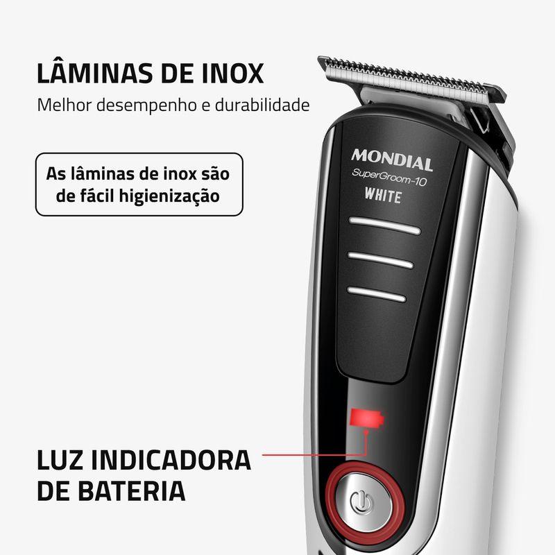 LÂMINAS EM AÇO INOX: As lâminas em aço inox asseguram um corte rente, preciso e suave. Além disso, garantem maior durabilidade ao produto.