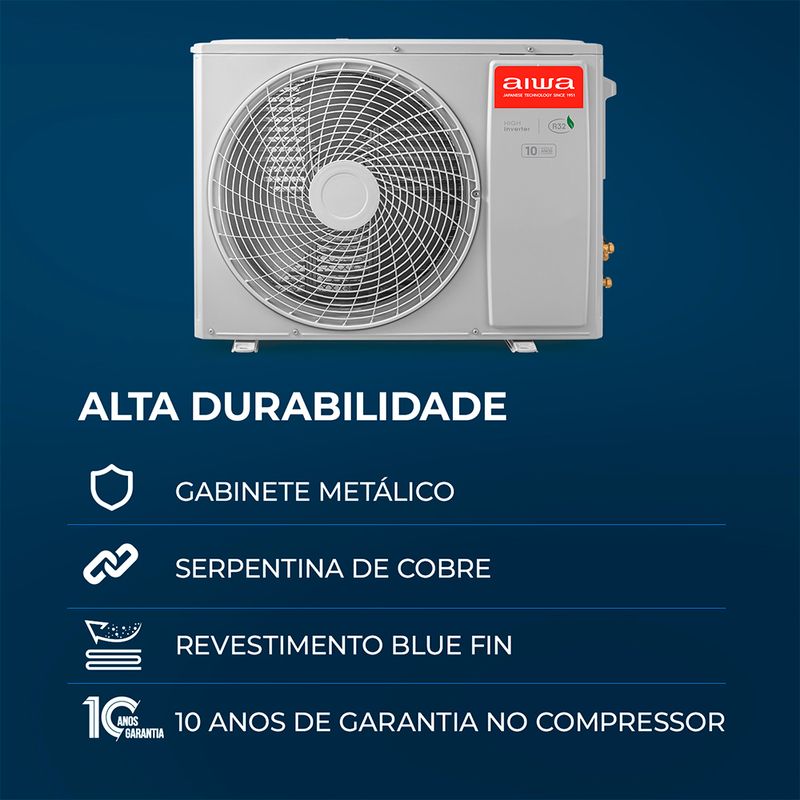Com Wi-Fi integrado, você controla todas as funções pelo aplicativo Aiwa Home ou por comandos de voz com Alexa e Google Assistente, trazendo conectividade e praticidade ao dia a dia. Durável e resistente, conta com gabinete metálico, serpentina de cobre e revestimento Blue Fin, que proporcionam maior proteção contra ferrugem, maresia e desgaste, além de 10 anos de garantia no compressor.