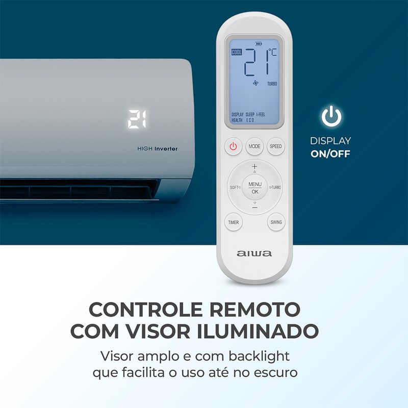 O aparelho conta com 4 modos de operação (frio, ventilação, desumidificação e automático), 5 velocidades de ventilação e oscilação automática da vane com até 5 posições ajustáveis. Com fluxo de ar de longo alcance, autodiagnóstico, controle remoto iluminado e funcionamento em ampla faixa de tensão, o ar-condicionado Aiwa une potência, economia, conectividade e bem-estar, tudo isso com a tradição e qualidade de uma marca referência em tecnologia e inovação.