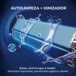 Ar Mais Puro: Sistema triplo de limpeza – autolimpeza, secagem interna e ionização, com as funções iClean, Anti-Fungos e Health. Eliminam até 99% das impurezas e evitam acúmulo de sujeira e formação de odores;