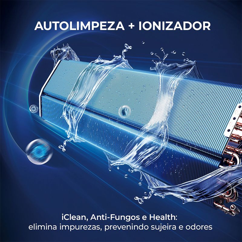 Ar Mais Puro: Sistema triplo de limpeza – autolimpeza, secagem interna e ionização, com as funções iClean, Anti-Fungos e Health. Eliminam até 99% das impurezas e evitam acúmulo de sujeira e formação de odores;
