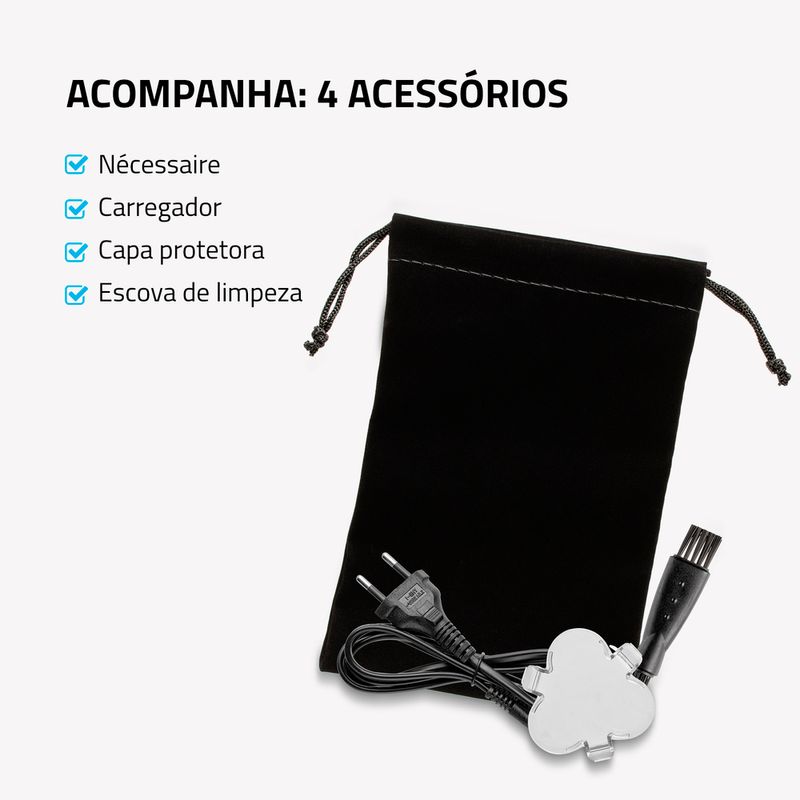 ACOMPANHA 4 ACESSÓRIOS: O aparelho vem acompanhado de quatro acessórios: Nécessaire, capa protetora, escova de limpeza e carregador.