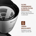 FILTRO PERMANENTE E PORTA-FILTRO REMOVÍVEL: A cafeteira dispensa a utilização do filtro de papel. Além de economizar, você ainda torna o seu dia a dia mais sustentável.