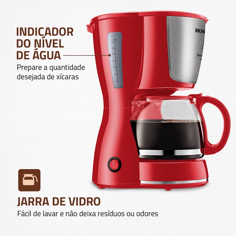 DESIGN SOFISTICADO: Na cor vermelha e acabamento em aço escovado, a cafeteira proporciona mais elegância à sua cozinha.