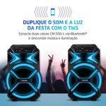 Duplique o som e a luz da festa: A função TWS permite conectar duas caixas iguais sem usar fio sincronizando música e iluminação para todo mundo dançar no mesmo ritmo.