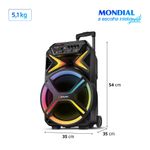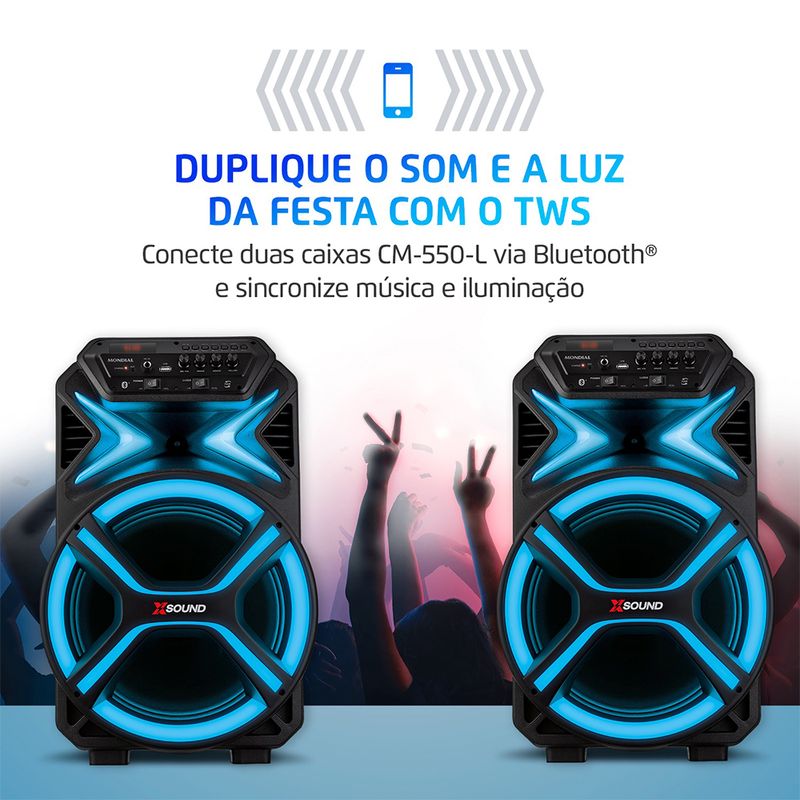 A caixa amplificada CM-550-L é ótima para quem adora comemorar! Com design compacto e bateria de até 12 horas você leva a festa para qualquer lugar e ainda pode controlar sua caixa usando o aplicativo Mondial Audio.
