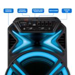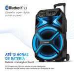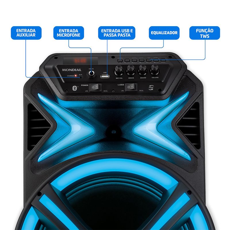 2 Conexões: Uma auxiliar para curtir músicas e outros conteúdos de áudio conectando a caixa a smartphones e notebooks. E outra entrada para microfone para soltar a voz no karaokê.