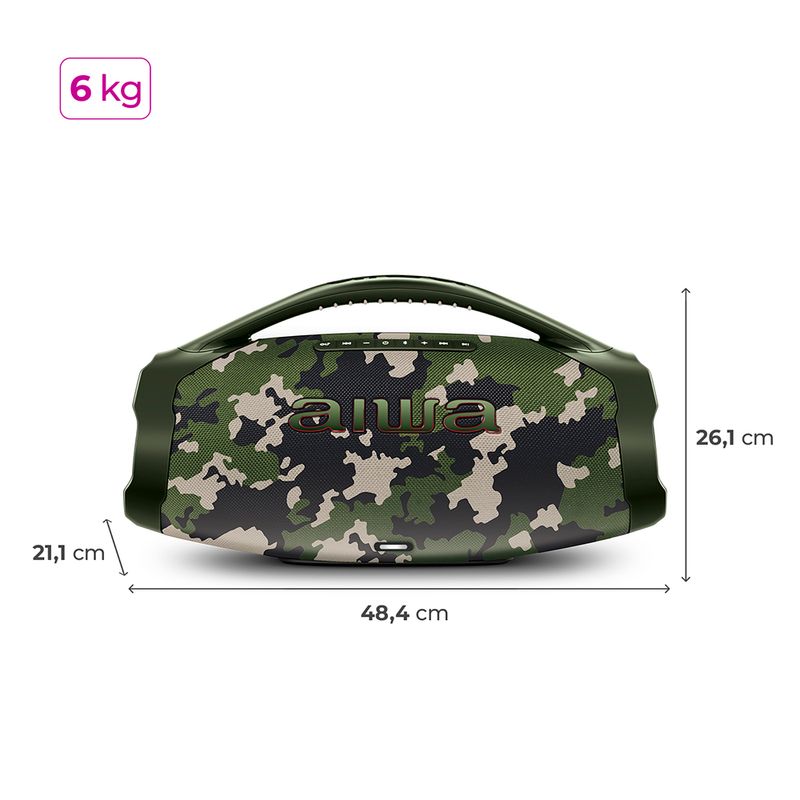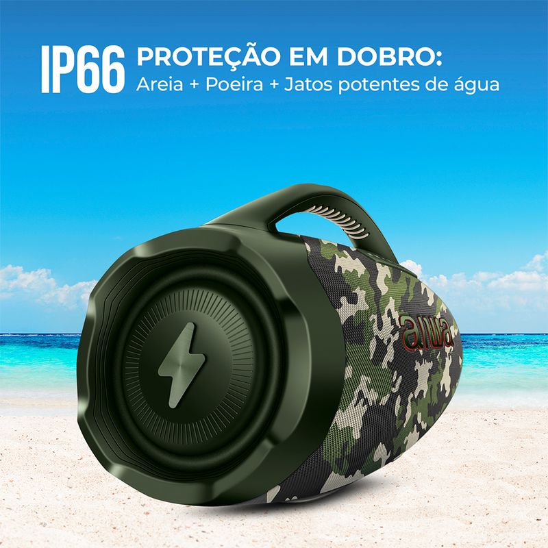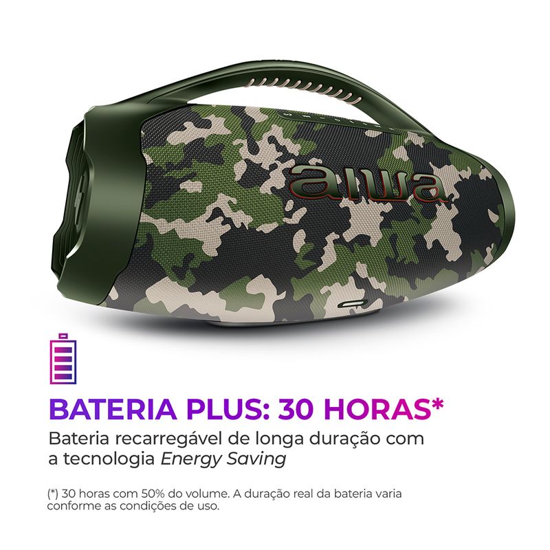 Reunir nossa família e amigos e desfrutar de uma boa música é um dos prazeres da vida, né? Curta um som potente e de alta definição com a Boombox Plus AWS-BBS-01-GR! A caixa de som portátil foi projetada com sistema de som de 3 vias - 1 subwoofer, 2 midranges e 2 tweeters -, além de ter dois radiadores passivos laterais, 200W RMS de potência e o DNA japonês da marca AIWA. Com o certificado IP66, você e sua turma podem ouvir sua playlist favorita na beira da piscina ou na praia sem preocupação, já que a Boombox é resistente a jatos potentes de água e tem proteção total contra poeira. Incrível, né? Saiba mais sobre a Boombox Plus AWS-BBS-01-GR: