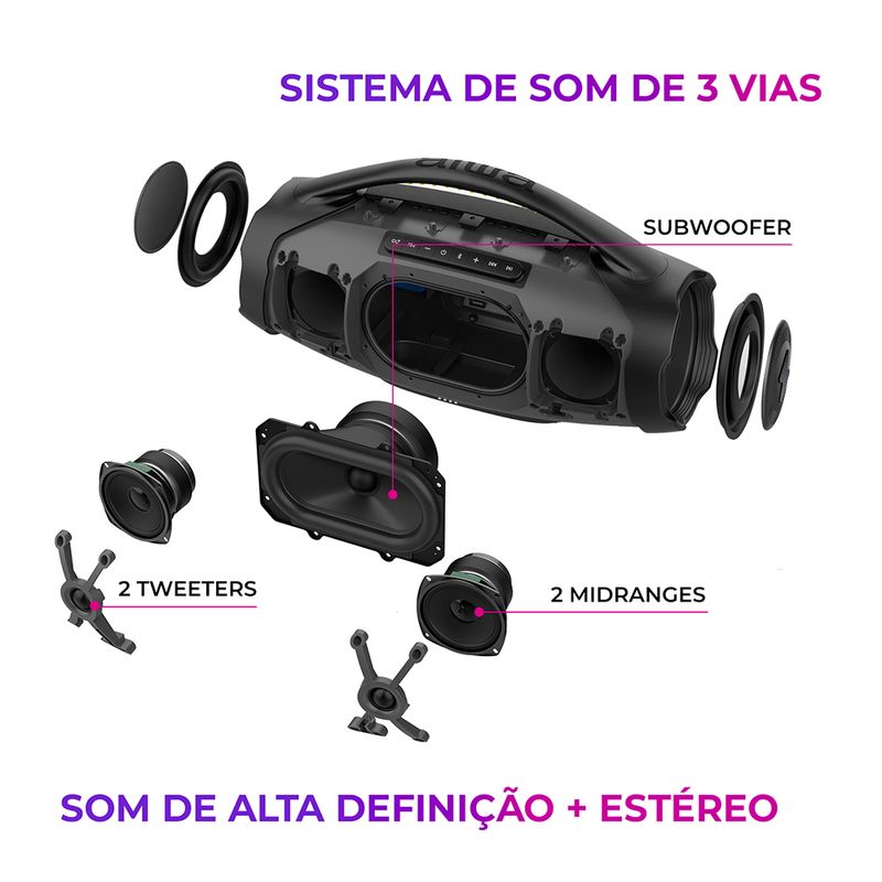 Preencha o ambiente com um som AIWA potente! Projetado com o sistema de som de 3 vias (3-Way Speaker System), a Boombox Light Plus AWS-BBS-01-LBL possui 1 subwoofer, 2 midranges e 2 tweeters, além de 3 amplificadores de áudio, um para cada canal (grave, médio e agudo), e com resposta de frequência dinâmica de 20Hz - 20KHz. O resultado? Uma experiência sonora com a pureza do DNA japonês AIWA®! Garantia de vocais claros e nitidez nos detalhes, assegurando um som perfeito e sem distorções.