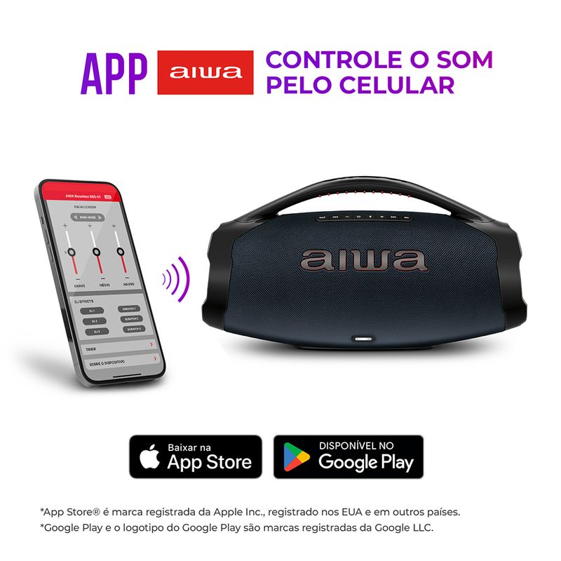 Controle as batidas da sua boombox pelo celular baixando o aplicativo AIWA Brasil.
