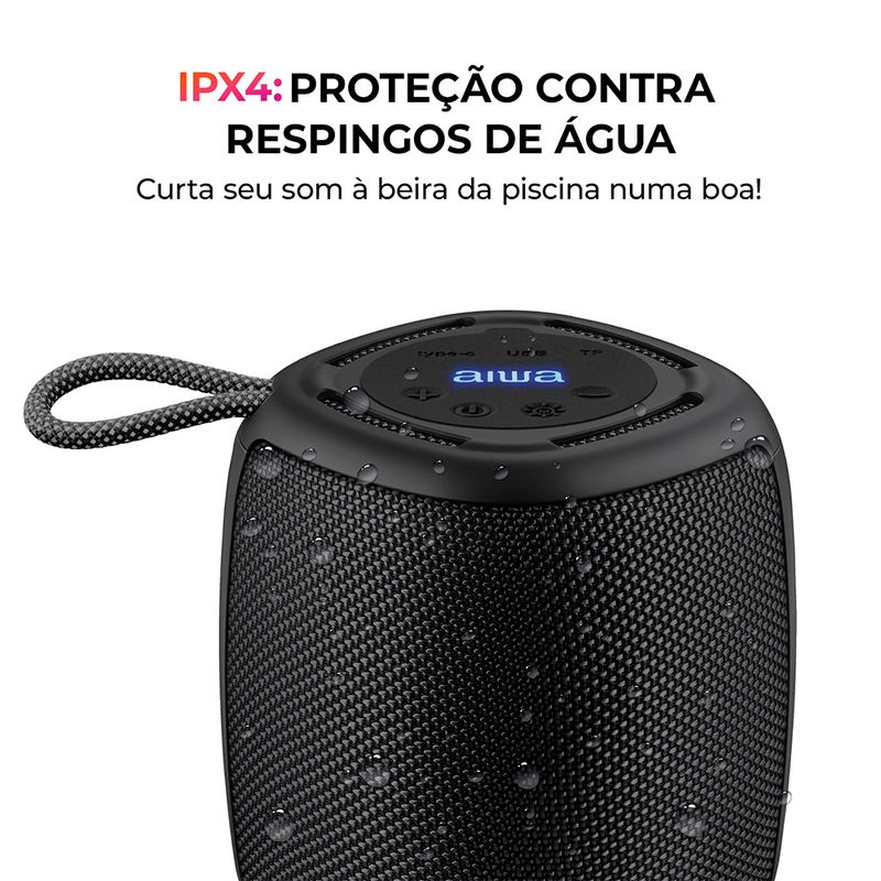 Resistência a respingos de líquidos: Com certificação IPX4, o speaker resiste a respingos de líquidos;
