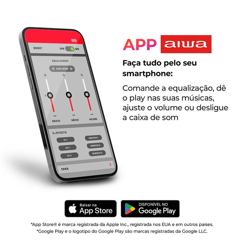 Controle o som pelo celular: O aplicativo AIWA Brasil permite ajustar DJ Effects, equalização, modos e níveis de intensidade das luzes da sua caixa de som portátil. Deixe a criatividade falar mais alto e leve a diversão a um novo patamar!