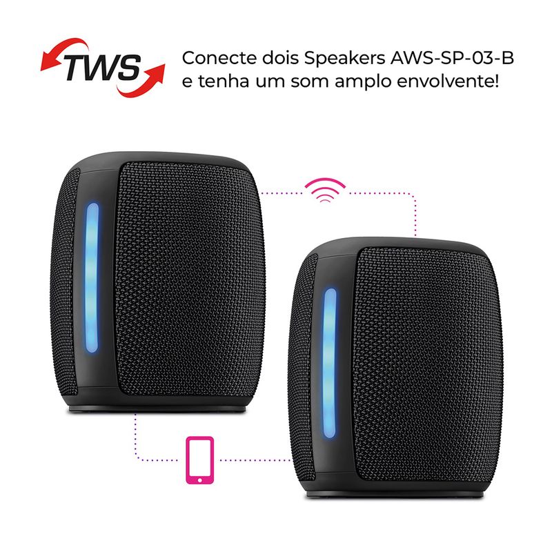 Intensifique o som: Conecte dois speakers AWS-SP-03-B e tenha um som duplicado.