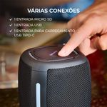 E tem mais: o speaker possui diversas opções de conexão — entradas para cartão de memória, USB e USB-C, facilitando o acesso às suas playlists de diferentes maneiras.