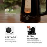 Com capacidade de 1,7 L, é possível fazer até 7 xícaras de chá de uma única vez. E seu visor transparente facilita o controle do nível de água. O sistema de aquecimento rápido reduz o consumo de energia ao ferver a água em poucos minutos. O filtro removível retém impurezas e facilita a higienização.