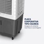 Placa Evaporativa Tipo Colmeia: O sistema evaporativo aumenta a eficiência da troca térmica entre a água e o ar, assegurando um ambiente mais fresco e aconchegante.