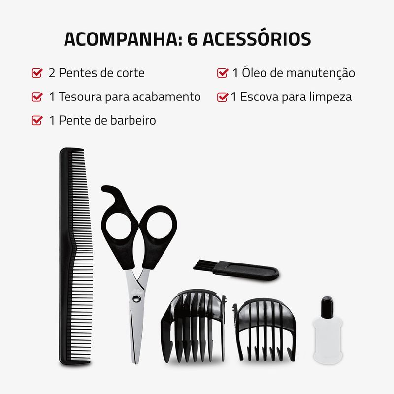 COMPLETO PARA SEU ESTILO: Acompanha tesoura, pente de barbeiro, escova de limpeza, óleo de manutenção e base carregadora.