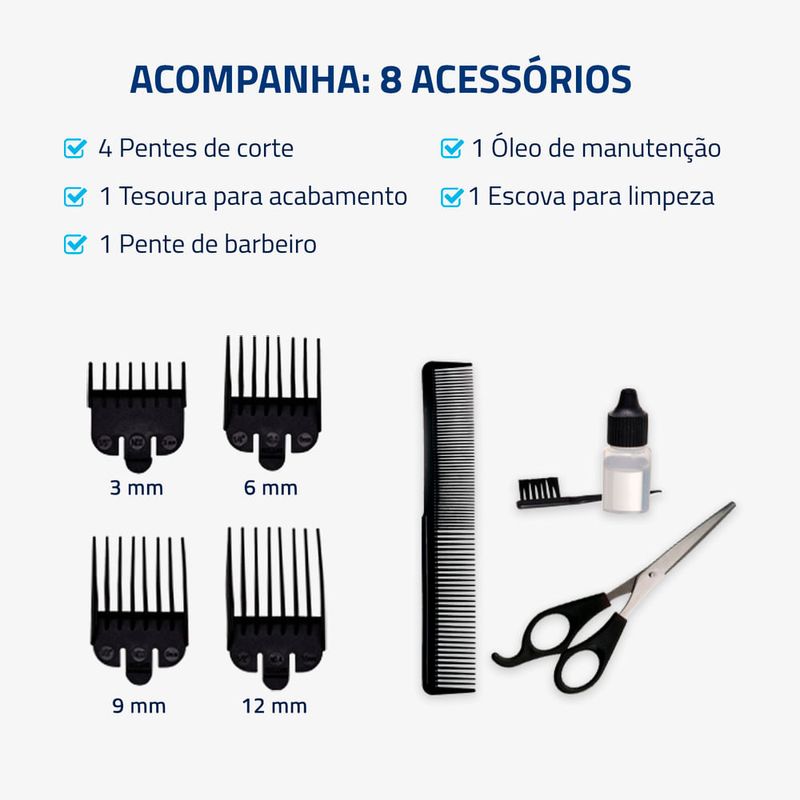COMPLETO PARA SEU ESTILO: Acompanha tesoura, pente de barbeiro, escova de limpeza e óleo de manutenção.
