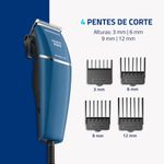 Acompanha 4 pentes de corte com 3 mm, 6 mm, 9 mm e 12 mm. Eles oferecem mais versatilidade e opções de corte.