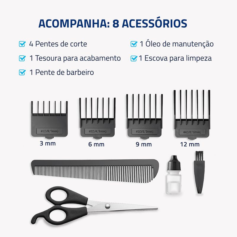 O cortador de cabelo vem acompanhado de 8 acessórios totais. São quatro pentes de corte, um pente de barbeiro, uma tesoura para acabamento, uma escova para limpeza e um óleo de manutenção. Tudo para você manter o visual em dia!