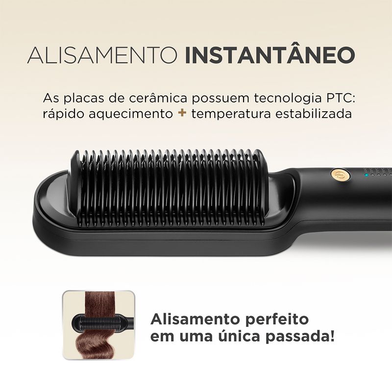 FÁCIL E PRÁTICO DE USAR: Basta selecionar a temperatura desejada, aguardar o aquecimento e deslizar a escova pela mecha de cabelo desde a raiz até as pontas. O liso é instantâneo!