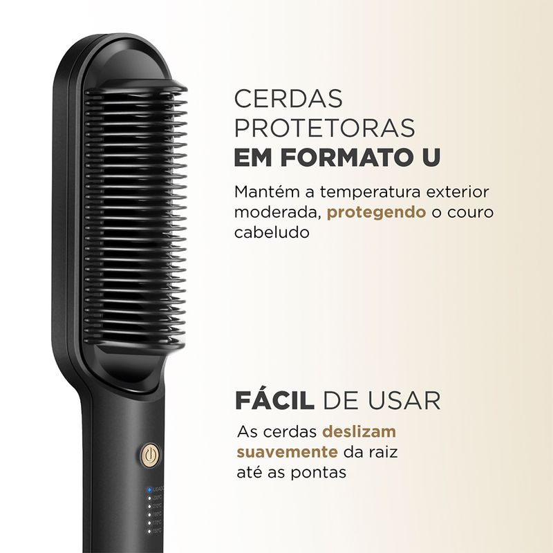 CERDAS PROTETORAS EM FORMATO “U”: Enquanto as placas de cerâmica no interior da escova aquecem até 230°C, o formato das cerdas em “U” mantém a temperatura exterior moderada, garantindo mais proteção para o couro cabeludo.