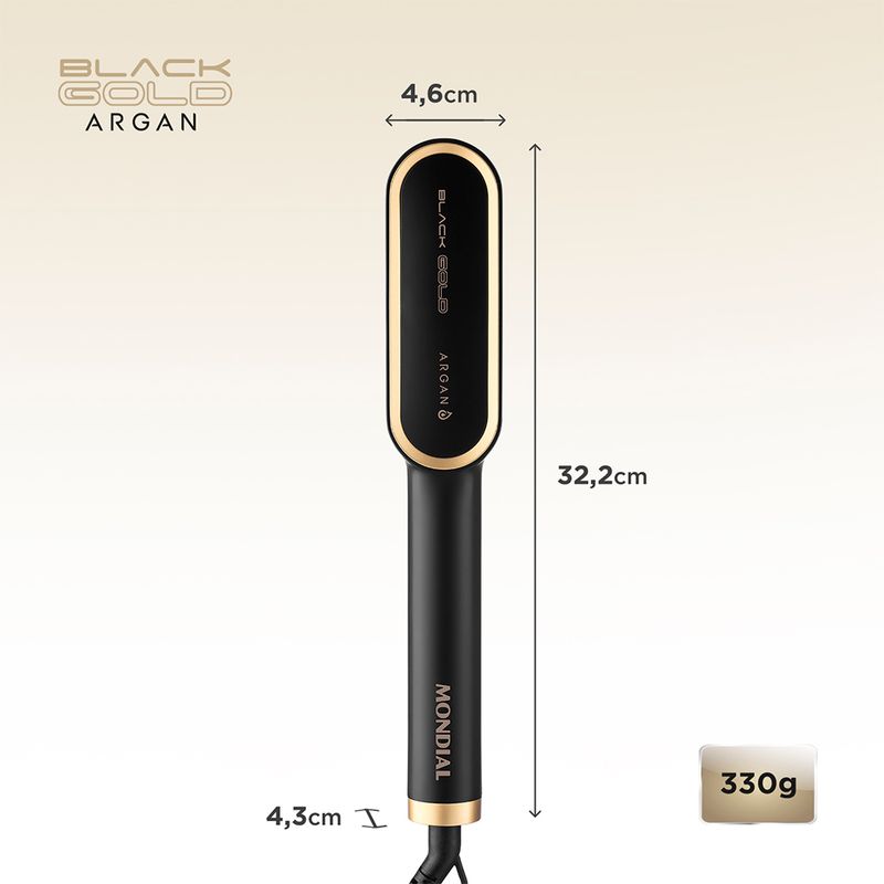 ALISAMENTO INSTANTÂNEO: As placas de cerâmica da Escova Black Gold Argan possuem tecnologia PTC, que promovem o rápido aquecimento, além de manter a temperatura estabilizada, garantindo um alisamento perfeito em uma única passada!