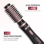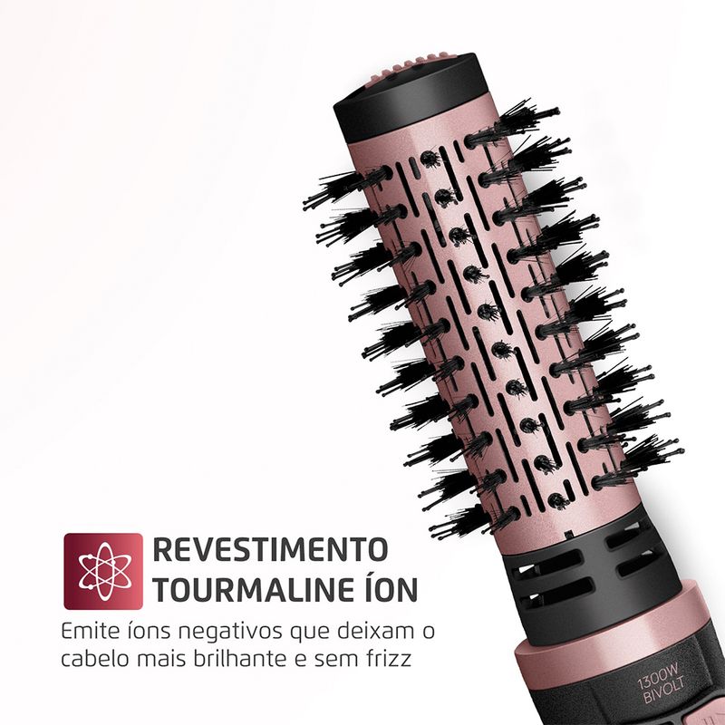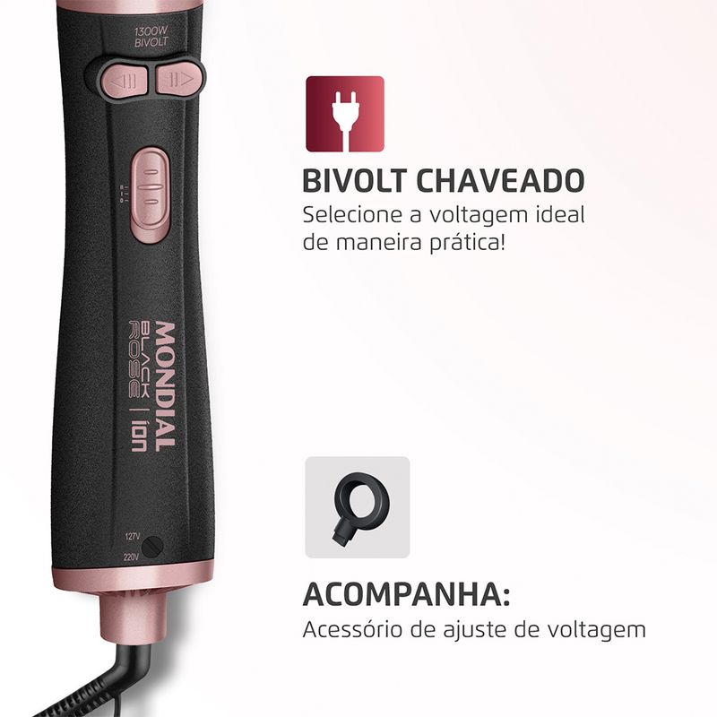 A escova rotativa Mondial Black Rose deixa sua rotina de beleza muito mais prática. Com ela, você seca, alisa e modela os cabelos usando apenas uma mão, simulando o efeito da escovação no salão. Possui revestimento cerâmico com Tourmaline Íon, que sela as cutículas e reduz o frizz, deixando os fios mais macios e brilhantes.