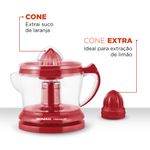 2 CONES PARA EXTRAÇÃO + PENEIRA: O cone maior é ideal para preparar sucos de laranja. Acompanha cone extra para frutas menores, como limão, sem gominhos.