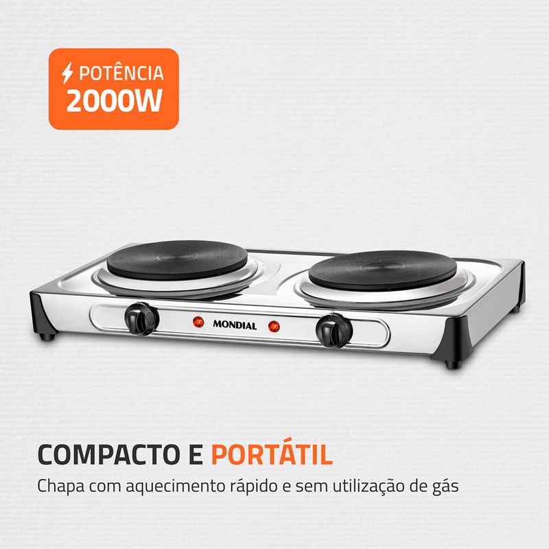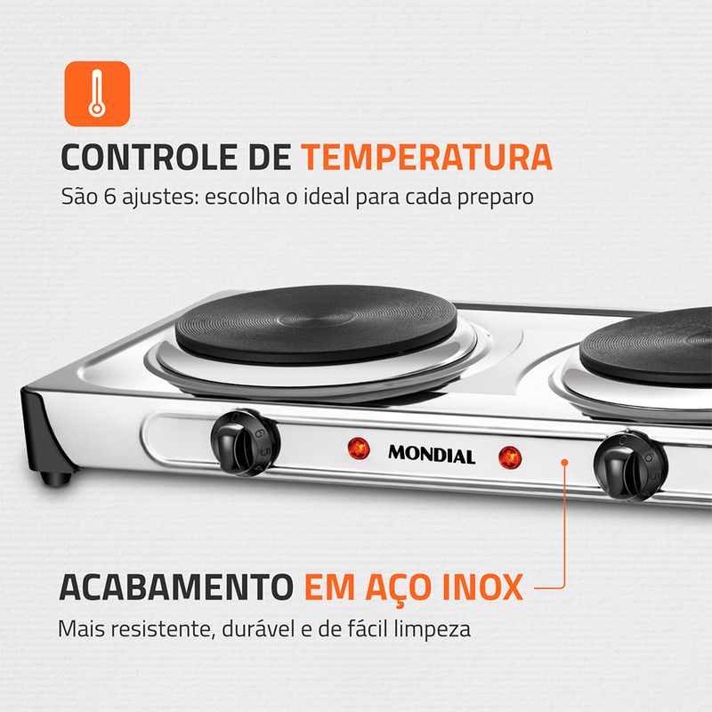 Prepare deliciosas receitas, com praticidade, em qualquer lugar! O Fogão Elétrico Fast Cook Dual Mondial possui duas chapas com aquecimento rápido e sem utilização de gás, totalizando 2000W de potência. Conta com 6 ajustes de temperatura para você escolher a ideal para cada tipo de preparo, como carnes, sopas, legumes e outros. Saiba mais sobre o FE-03 da Mondial: