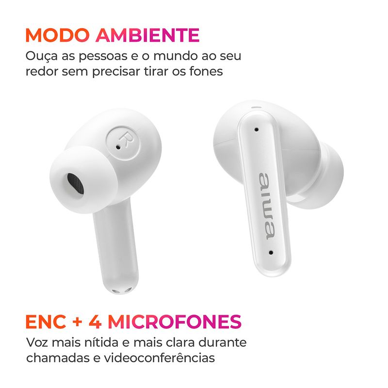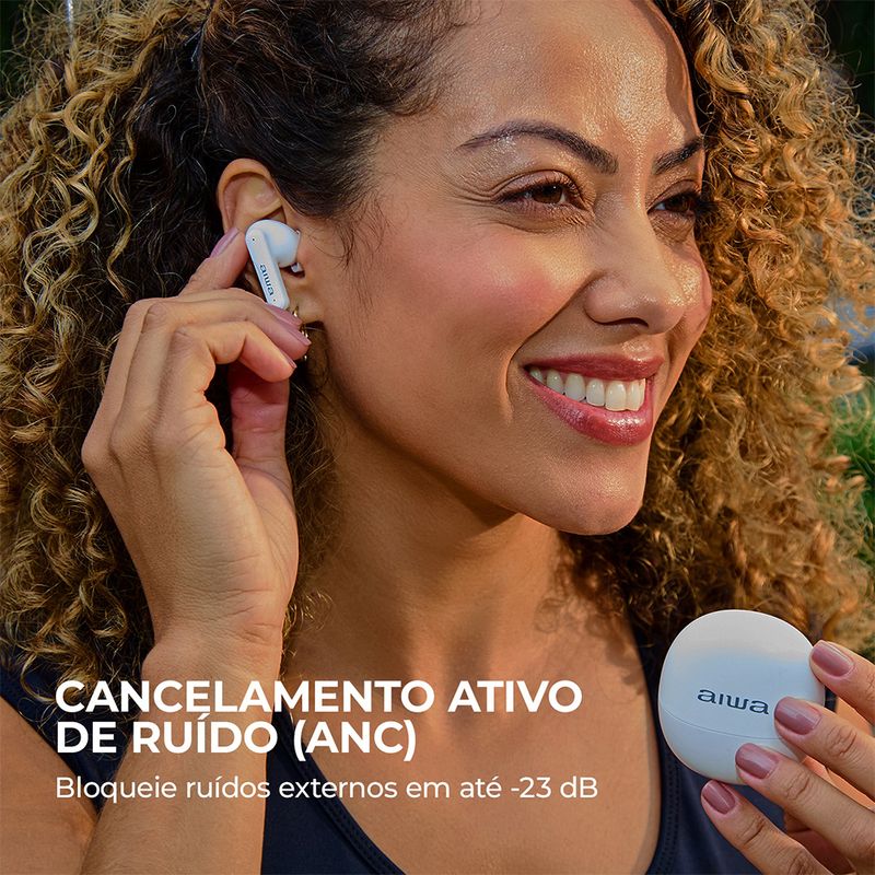 Descubra cada detalhe das suas músicas com o AWS-EB-04-W, da AIWA! Equipado com diafragma composto e drivers de neodímio, esses fones de ouvido sem fio realçam graves potentes e trazem médios e agudos nítidos, proporcionando uma experiência sonora rica e equilibrada. O Cancelamento Ativo de Ruído (ANC) elimina interferências e reduz o som ambiente em até -23 dB, para oferecer uma imersão total. Já em momentos que é preciso manter a atenção no que acontece ao redor, basta ativar o Modo Ambiente para ouvir o som externo sem precisar remover o os fones. Além de todos esses benefícios, as conversas por áudio e vídeo vão ficar ainda melhores com o Aprimoramento de Voz para Chamadas (ENC). São 4 microfones integrados, que capturam cada detalhe da voz com precisão, proporcionando chamadas de vídeo e áudio mais nítidas. Com design moderno e tecnologias avançadas, os fones AWS-EB-04-W combinam estilo e alta performance para elevar sua experiência sonora no dia a dia!