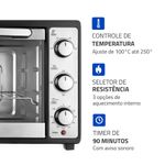 Timer de 90 Minutos: Programe o tempo de cada alimento com a segurança do desligamento automático com aviso sonoro. Mais comodidade para você fazer outras tarefas enquanto o forno trabalha.