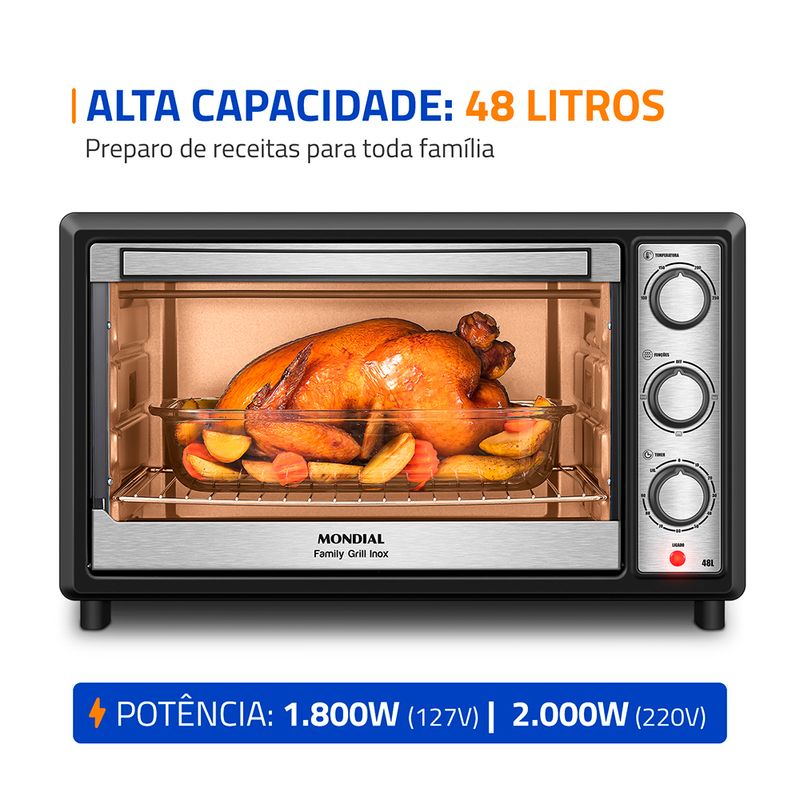 Capacidade de 48 Litros: Espaçoso e com alto desempenho, permite preparar vários pratos ao mesmo tempo ou assar receitas grandes, ideal para toda família.