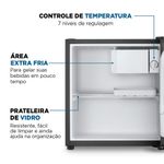 Conta ainda com 7 níveis de controle de temperatura, permitindo o ajuste ideal para todos os tipos de alimentos e bebidas, e pés niveladores ajustáveis para manter a estabilidade do frigobar em qualquer superfície, mesmo em pisos irregulares.