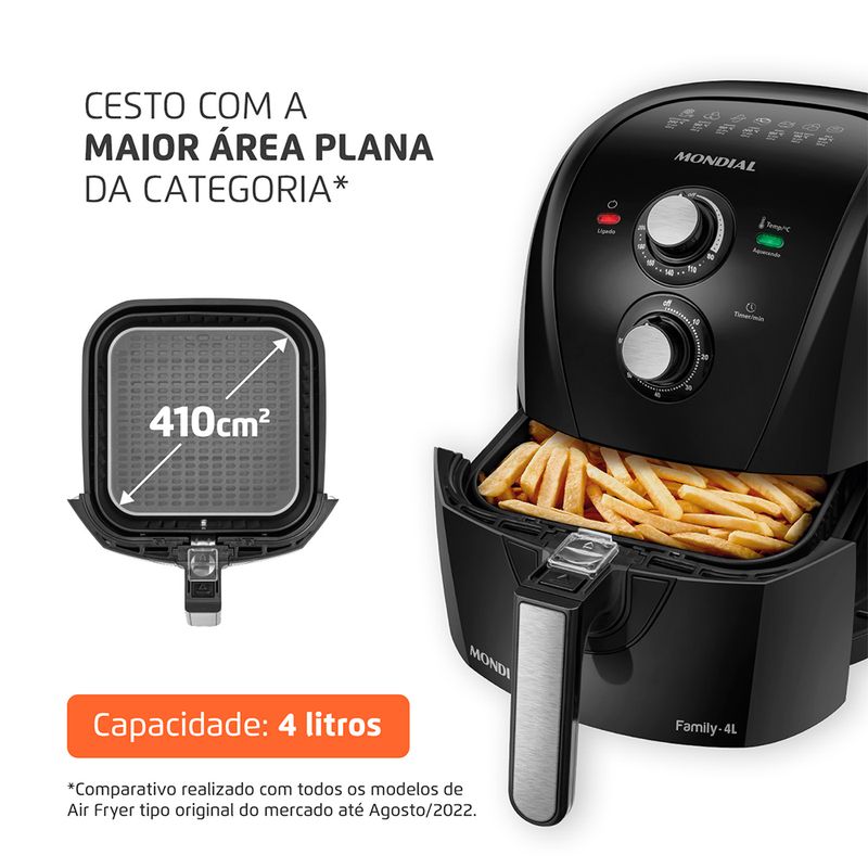 CAPACIDADE DE 4 LITROS + CESTO QUADRADO: Considerado o cesto com a maior área plana da categoria*, ele acomoda melhor os alimentos, permitindo assar e fritar por igual.