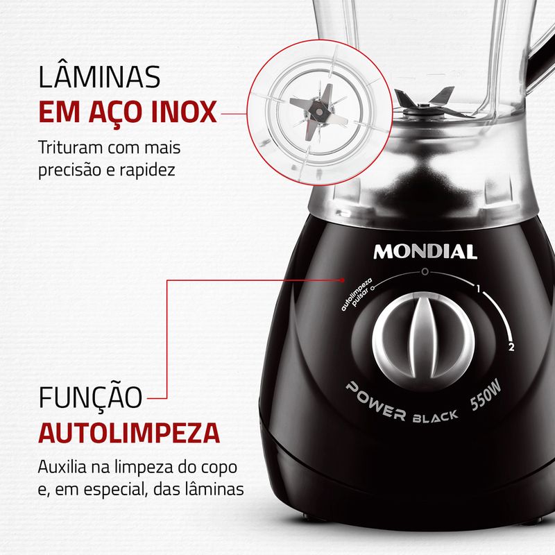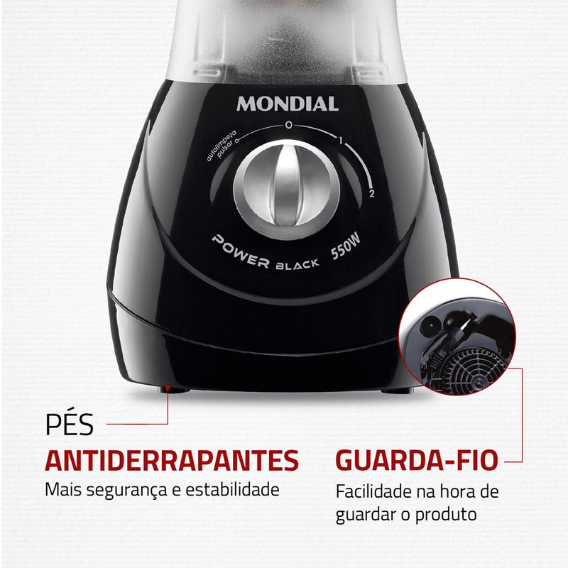 O liquidificador Mondial Power 2 Black 550W é um aliado na rotina na cozinha. São 550W de potência, capacidade total de 1,9 litros, além de 2 velocidades + Função Pulsar, que tritura até ingredientes mais duros. Você pode preparar torta de frango, bolo de milho, pão de queijo, massa de panqueca, queijadinha e muitas outras receitas com praticidade e rapidez. Saiba mais sobre o L-28: