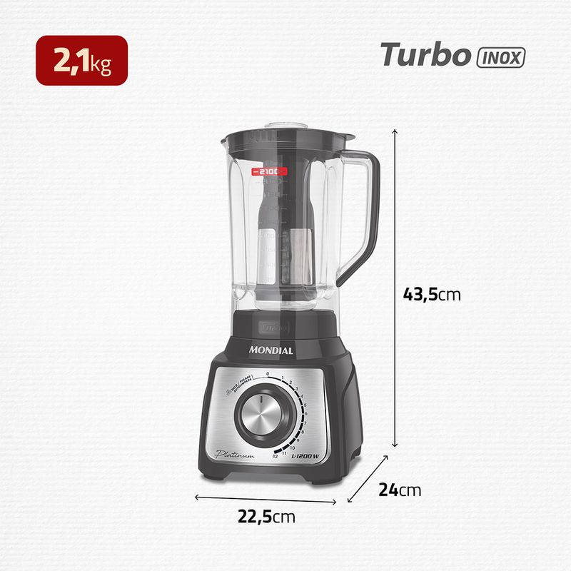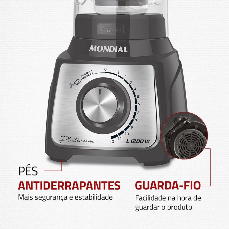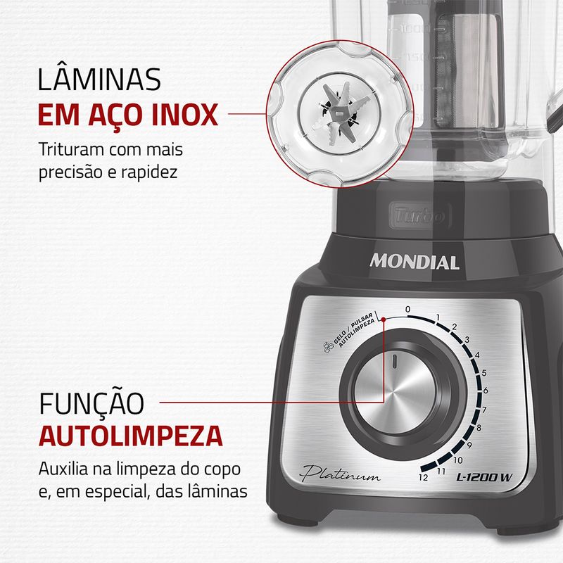 O Liquidificador Platinum L-1200-PI é a escolha perfeita para preparar receitas “tamanho família” de uma só vez! O liquidificador Mondial tem 1.200W de potência, jarra com 3 litros de capacidade total e 12 velocidades. Características ideais para economizar seu tempo e tornar a cozinha um lugar de praticidade. Prepare torta de frango, bolo de milho, pão de queijo, massa de panqueca, queijadinha e muitas outros pratos. Saiba mais sobre o L-1200-PI: