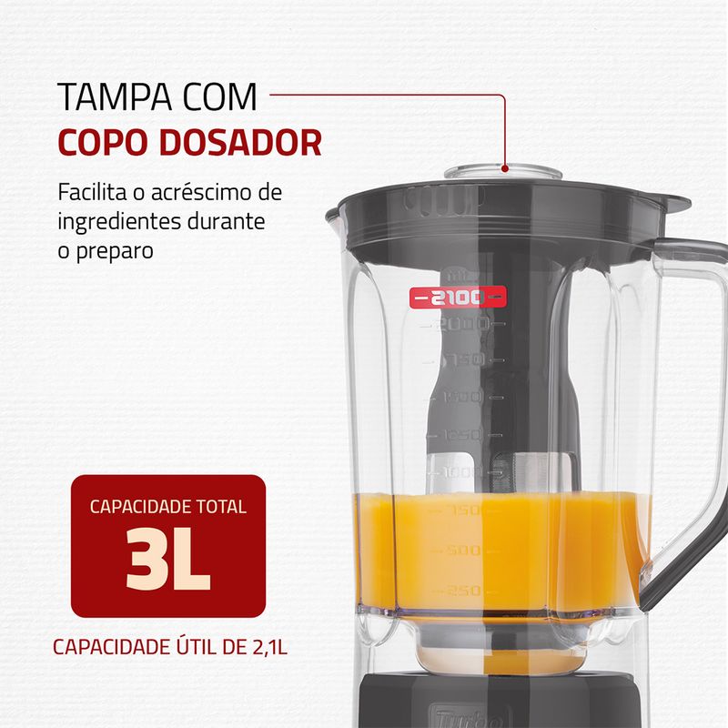 CAPACIDADE* TOTAL: 3 LITROS: Que tal preparar sucos, molhos e outras receitas para toda a família? Com a jarra de 3 litros, você produz grandes porções de uma vez só e economiza seu tempo. *Capacidade útil de 2,1 litros.