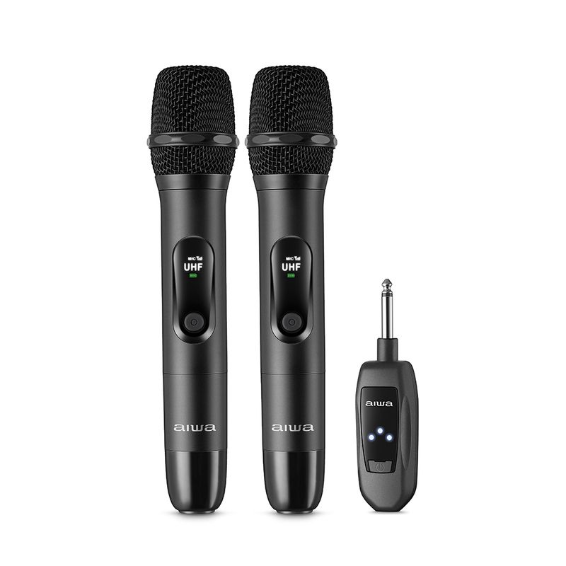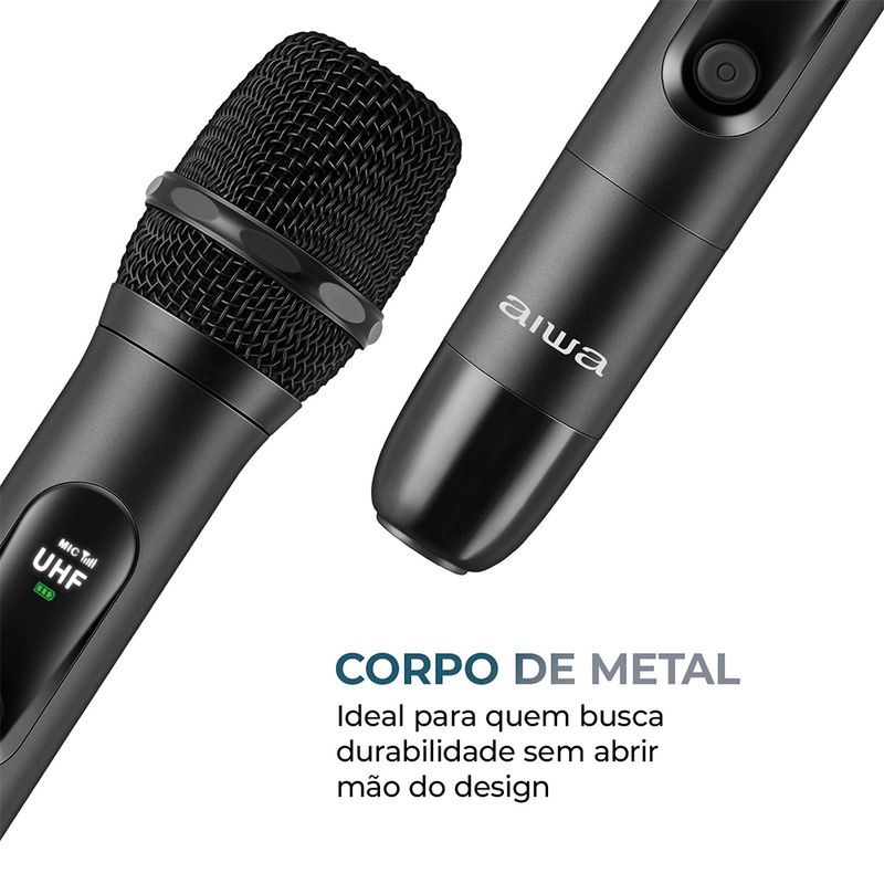 Reúna os amigos para se divertir! O par de Microfone Sem Fio AWS-MIC-01 da Aiwa com tecnologia de redução de ruído foi projetado para captar apenas o que realmente importa — sua voz. Sons como respiração, toque nas mãos ou vento ficam em segundo plano, para entregar melhor clareza sonora. Com até 10 horas de bateria, ele é ideal para animar seus karaokês sem interrupções. O design em metal, além de resistente, é moderno e elegante. Saiba mais sobre o AWS-MIC-01: