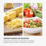 FACA EM AÇO INOX: Muito mais prático e eficiente. Tritura e mistura com perfeição as frutas, vegetais, queijos, carnes, castanhas, cocos, torradas, temperos e outros alimentos.