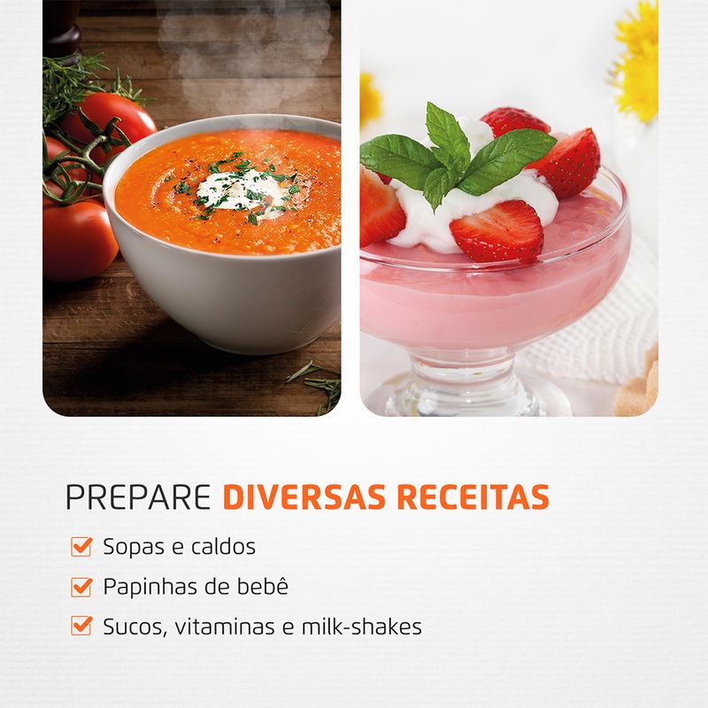 O mixer é ideal para preparar vitaminas, caldos, sopas, cremes, purês, papinhas de bebê e até desfiar frango.