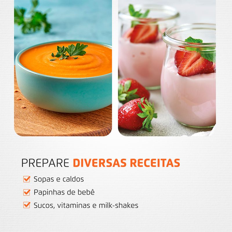 Versatilidade de Receitas: O mixer é ideal para preparar sopas, caldos, cremes, purês, papinhas de bebê, sucos, vitaminas, milk-shakes e muitos mais.