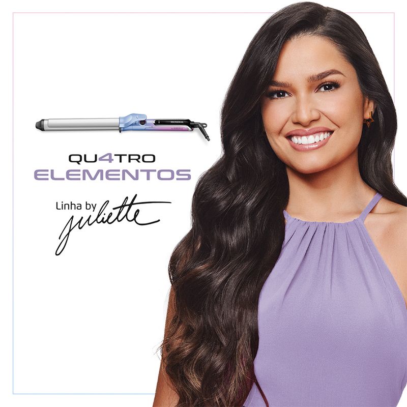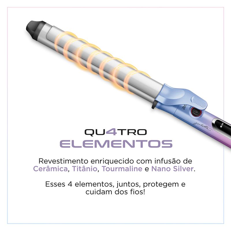 O Modelador de Cachos da Linha by Juliette Qu4tro Elementos traz um revestimento especial enriquecido com infusão de Cerâmica, Titânio, Tourmaline e Nano Silver. Esses 4 elementos, juntos, protegem seus fios e garantem uma aparência mais saudável aos cabelos, com brilho intenso, maciez e sem frizz. Saiba mais sobre o Modelador de Cachos MC-JU-03: